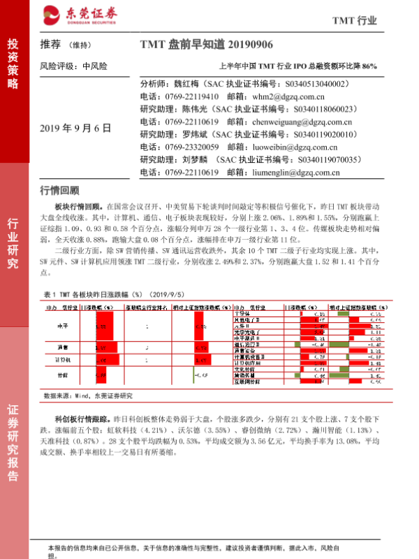 【东莞证券】【20190906】20190906-东莞证券-TMT盘前早知道:上半年中国TMT行业IPO总融资额环比降86%-4页 行业研究