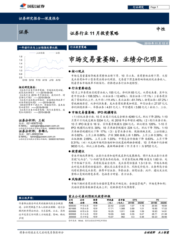 【国信证券】【20191112】证券行业11月投资策略:市场交易量萎缩,业绩分化明显-8页 行业研究