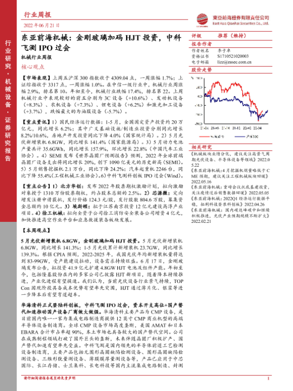 【东亚前海证券】【20220620】东亚前海机械:金刚玻璃加码HJT投资,中科飞测IPO过会-23页 行业研究