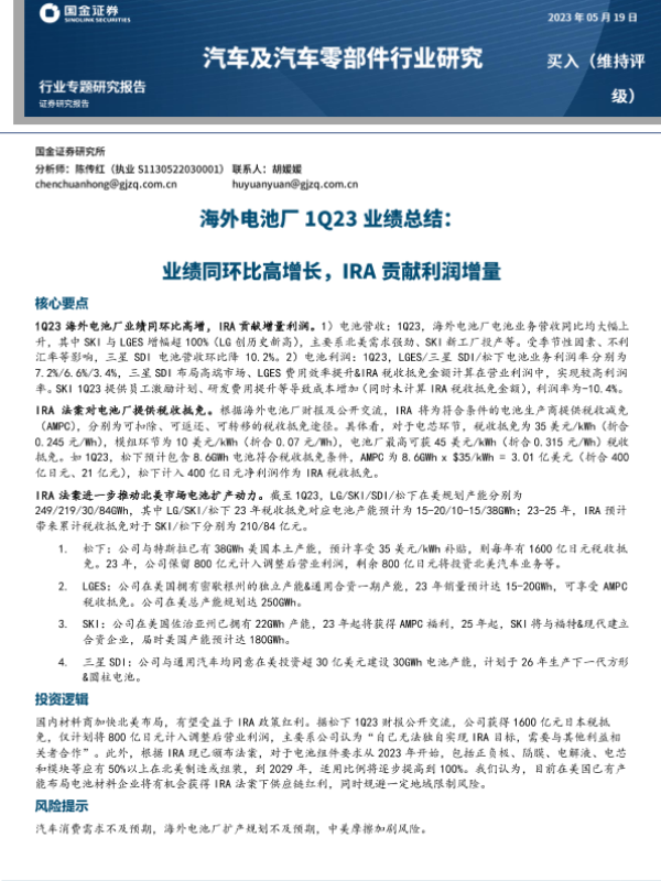 【国金证券】【20230519】汽车及汽车零部件行业研究:海外电池厂1Q23业绩总结-业绩同环比高增长,IRA贡献利润增量-12页 行业研究