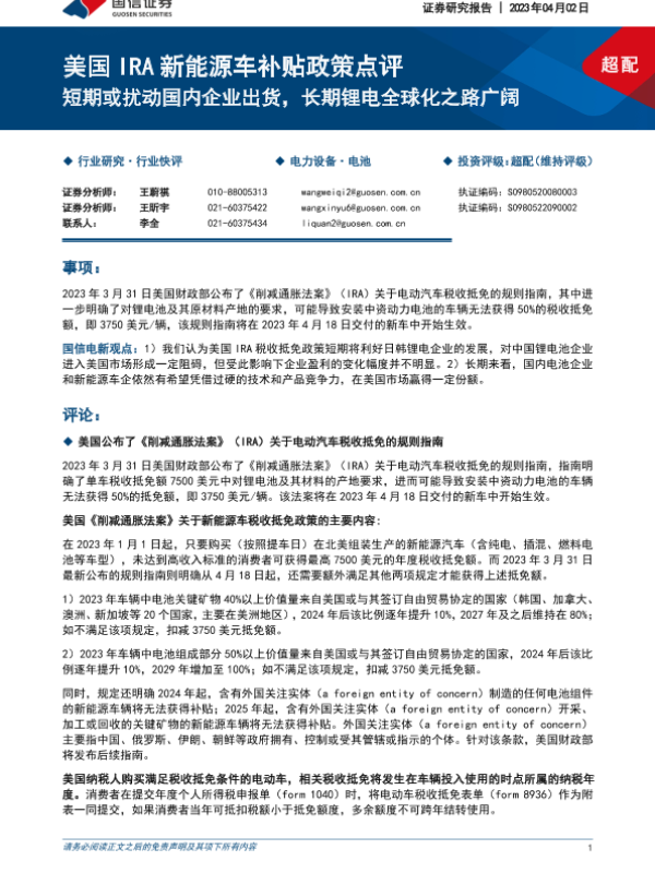 【国信证券】【20230402】美国IRA新能源车补贴政策点评:短期或扰动国内企业出货,长期锂电全球化之路广阔-10页 行业研究