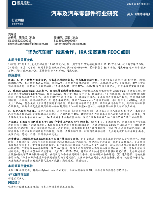 【国金证券】【20231205】2023-12-05-汽车及汽车零部件行业研究-“华为汽车圈”推进合作-IRA法案更新FEOC细则-16页 行业研究