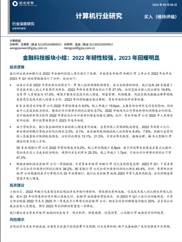 【国金证券】【20230506】国金证券-计算机行业研究-金融科技板块小结:2022年韧性较强,2023年回暖明显-15页 行业研究