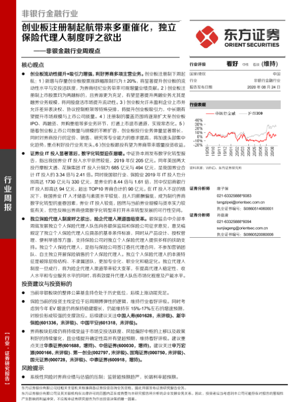 【东方证券】【20200824】非银行金融行业周观点:创业板注册制起航带来多重催化,独立保险代理人制度呼之欲出-13页 行业研究