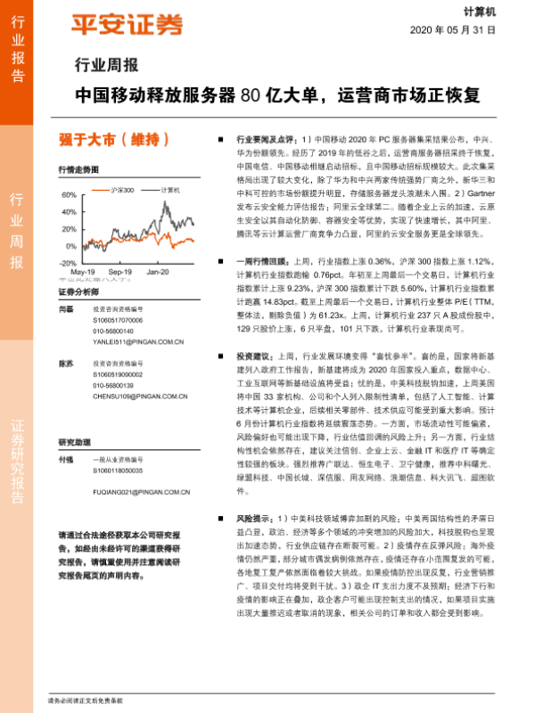 【平安证券】【20200531】20200531-平安证券-计算机行业周报:中国移动释放服务器80亿大单,运营商市场正恢复-6页 行业研究