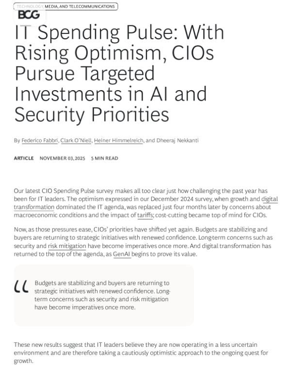 【Boston Consulting Group】【202511】IT Spending Pulse With Rising Optimism, CIOs Pursue Targeted Investments in AI and Security Priorities-7页 市场调研