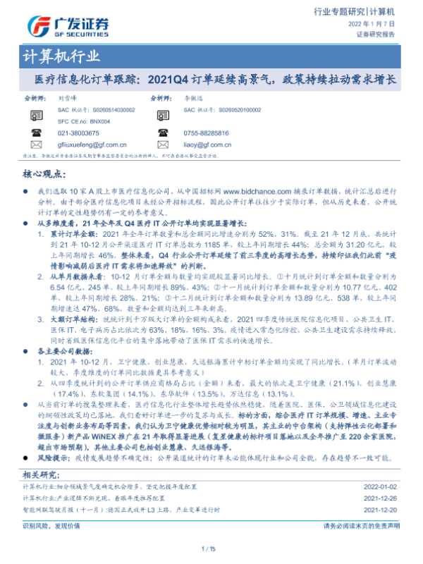 【广发证券】【20220107】医疗信息化订单跟踪:2021Q4订单延续高景气,政策持续拉动需求增长-15页 行业研究