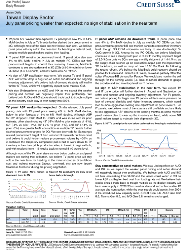 【Credit Suisse】【20220725】CS-Taiwan Display Sector -220725-7页 行业研究