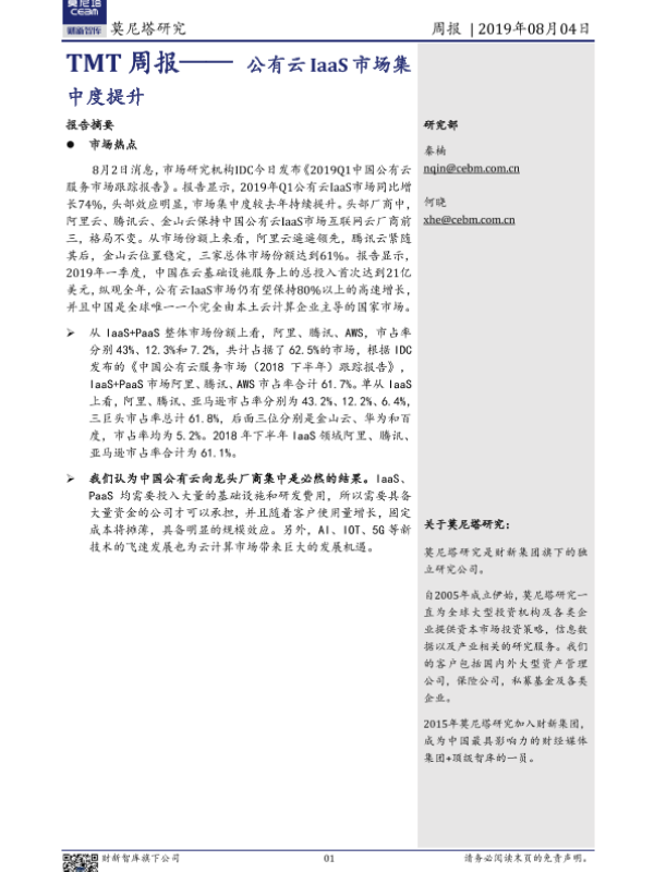 【莫尼塔研究】【20190804】TMT周报——公有云IaaS市场集中度提升-6页 行业研究