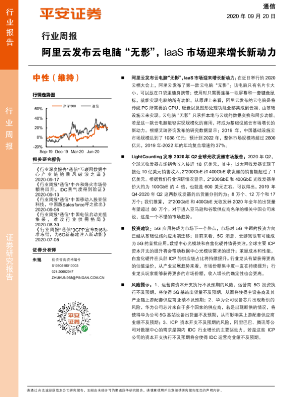 【平安证券】【20200920】通信行业周报:阿里云发布云电脑“无影”,IaaS市场迎来增长新动力-5页 行业研究