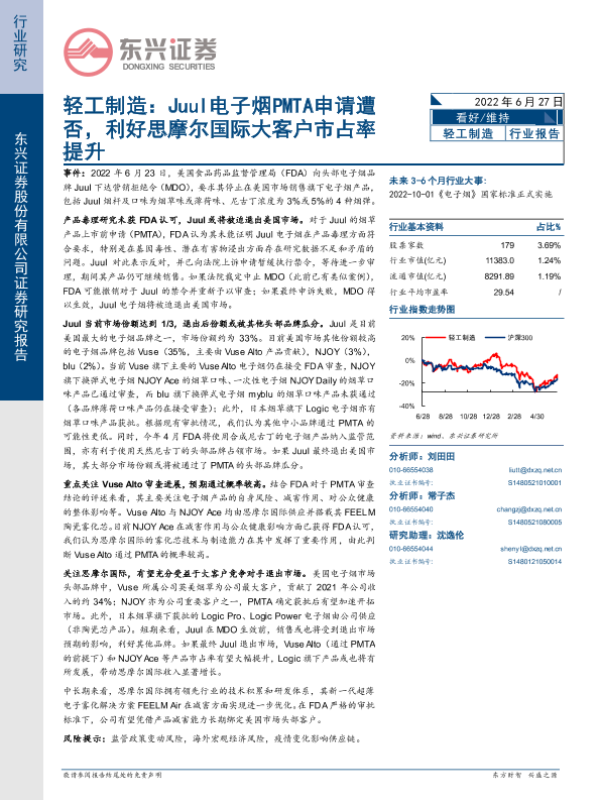 【东兴证券】【20220627】轻工制造:Juul电子烟PMTA申请遭否,利好思摩尔国际大客户市占率提升-5页 行业研究