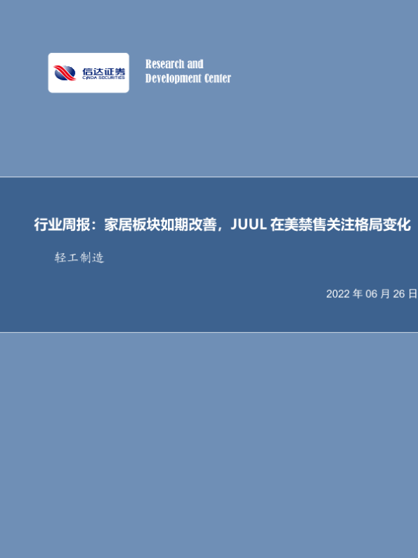 【信达证券】【20220626】20220626-信达证券-轻工制造行业周报:家居板块如期改善,JUUL在美禁售关注格局变化-20页 行业研究