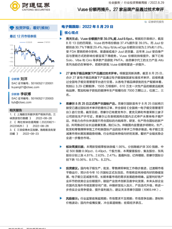 【财通证券】【20220829】社会服务行业投资策略周报:电子烟跟踪,Vuse份额再提升,27家品牌产品通过技术审评-8页 行业研究