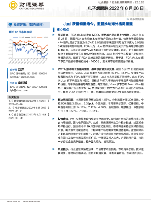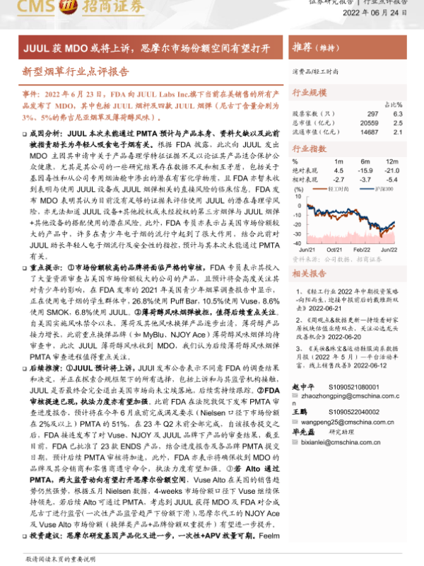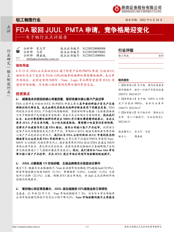 【浙商证券】【20220624】FDA驳回JUUL PMTA申请,竞争格局迎变化-3页 行业研究