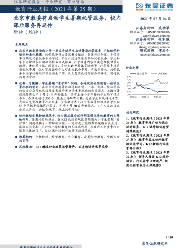 【东吴证券】【20210704】教育行业周报(2021年第25期):北京市教委将启动学生暑期托管服务,校内课后服务再延伸-10页 行业研究