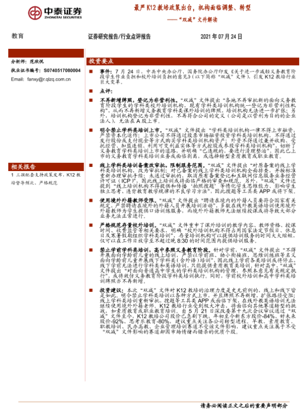 【中泰证券】【20210724】教育行业“双减”文件解读:最严K12教培政策出台,机构面临调整、转型-2页 行业研究