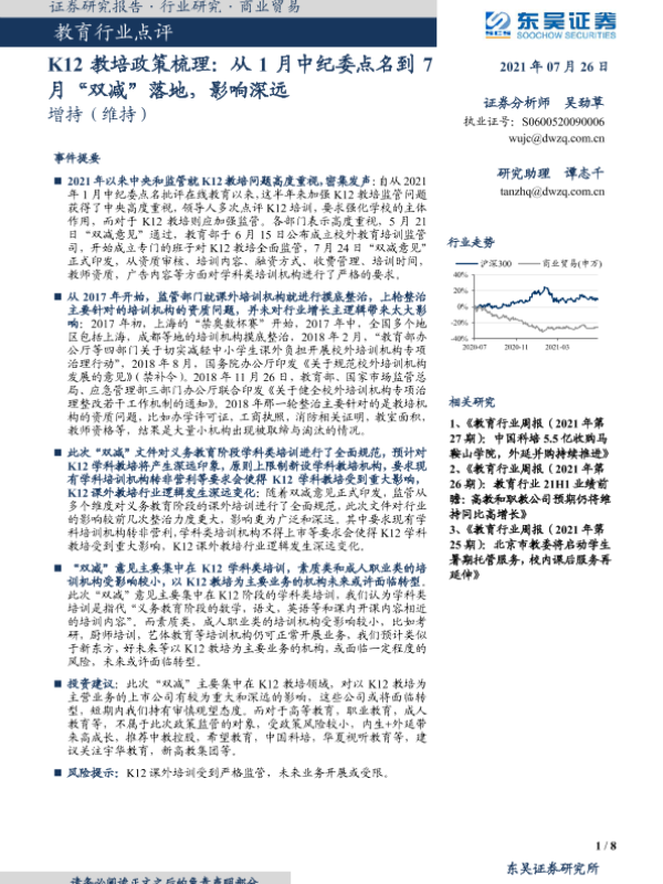 【东吴证券】【20210726】20210726-东吴证券-教育行业点评:K12教培政策梳理:从1月中纪委点名到7月“双减”落地,影响深远-8页 行业研究