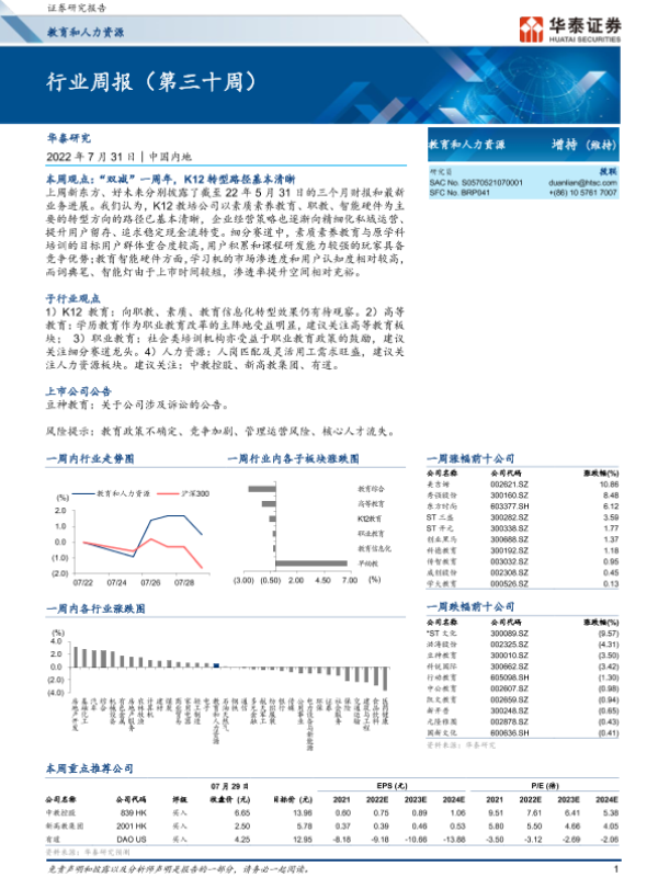 【华泰证券】【20220731】教育和人力资源行业周报(第三十周)-14页 行业研究