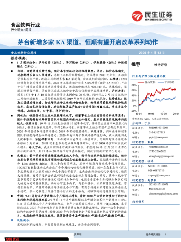 【民生证券】【20200113】20200113-民生证券-食品饮料行业周报:茅台新增多家KA渠道,恒顺有望开启改革系列动作-24页 行业研究