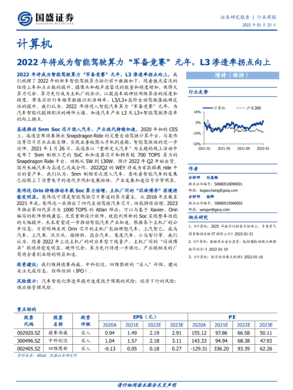 【国盛证券】【20220122】2022年将成为智能驾驶算力“军备竞赛”元年,L3渗透率拐点向上-8页 行业研究