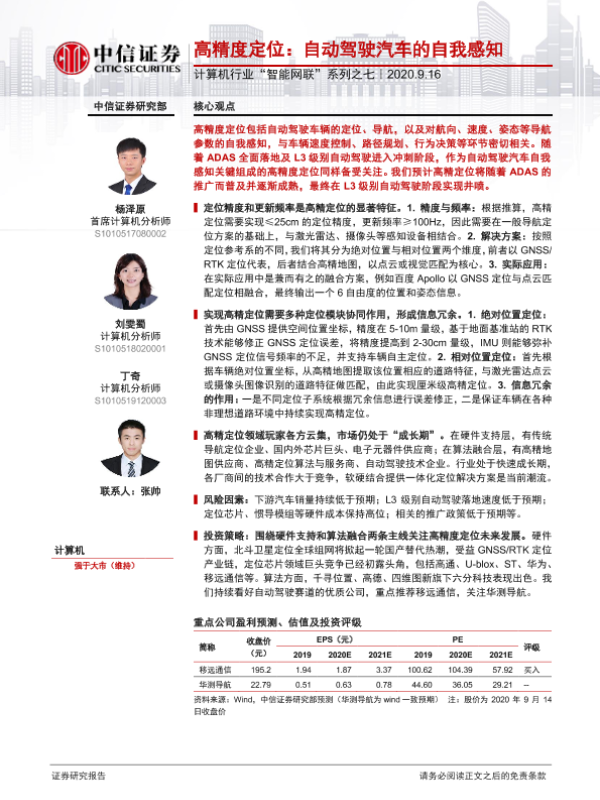 【中信证券】【20200916】计算机行业“智能网联”系列之七:高精度定位:自动驾驶汽车的自我感知-16页 行业研究