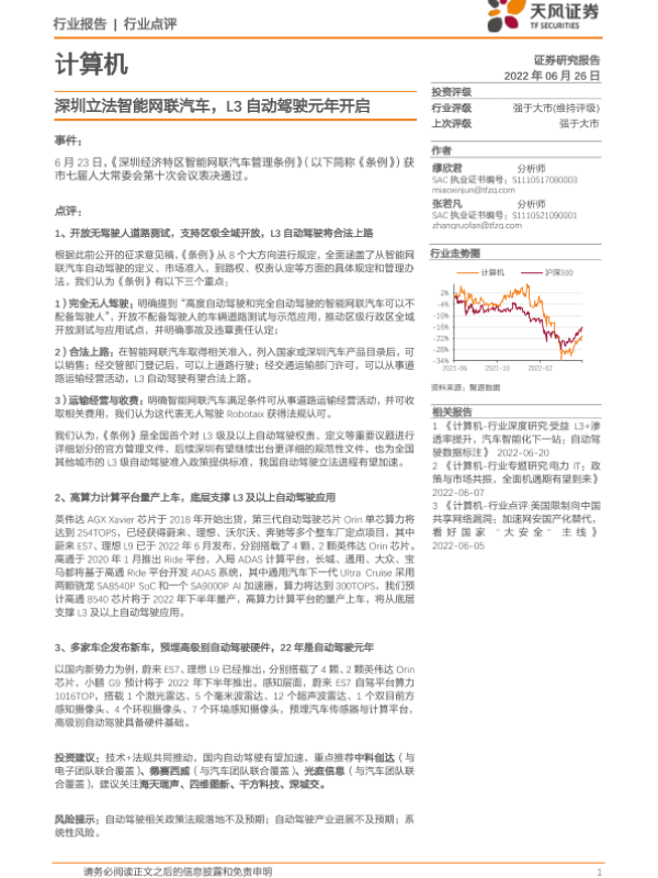 【天风证券】【20220626】计算机行业点评:深圳立法智能网联汽车,L3自动驾驶元年开启-2页 行业研究