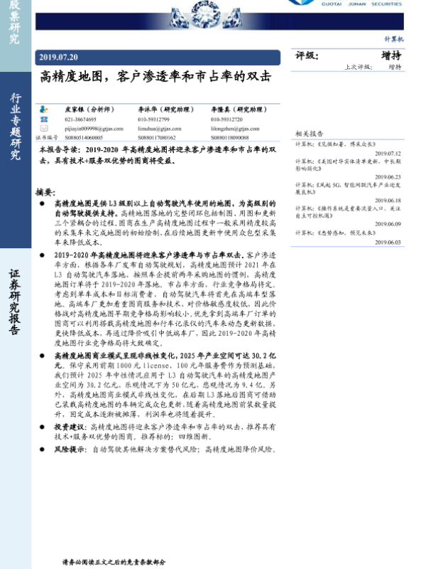 【国泰君安证券】【20190720】高精度地图,客户渗透率和市占率的双击-17页 行业研究