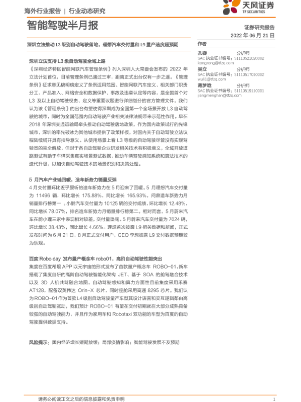【天风证券】【20220621】智能驾驶半月报:深圳立法推动L3级别自动驾驶落地,理想汽车交付量和L9量产速度超预期-7页 行业研究