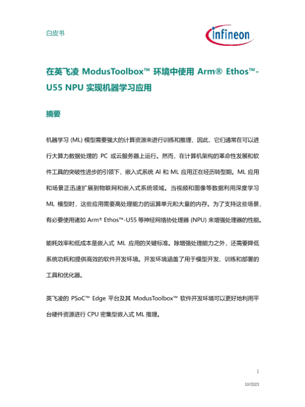 【英飞凌】【202310】在英飞凌 ModusToolbox™环境中使用 Arm® Ethos™-U55 NPU实现机器学习应用-17页 白皮书