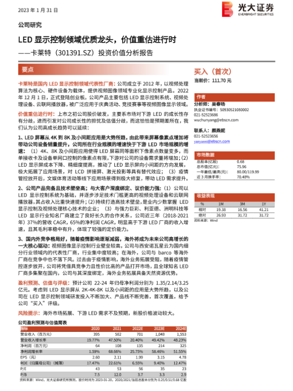 【光大证券】【20230131】20230131-光大证券-卡莱特-301391.SZ-投资价值分析报告:LED显示控制领域优质龙头,价值重估进行时-31页 行业研究