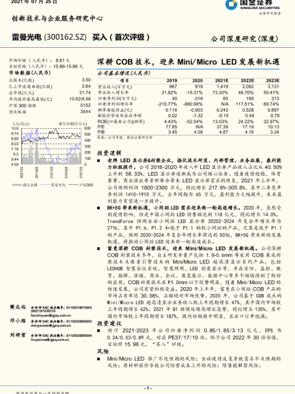 【长城证券】【20210525】20210525-长城证券-雷曼光电-300162.SZ-公司深度报告:COB技术到达应用奇点,微小间距LED显示屏龙头迎快速发展期-19页 行业研究