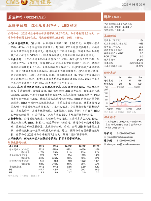 【海通证券】【202508】蔚蓝锂芯(002245)业绩超预期,锂电池量利齐升,LED恢复-10页 证券期货研究报告