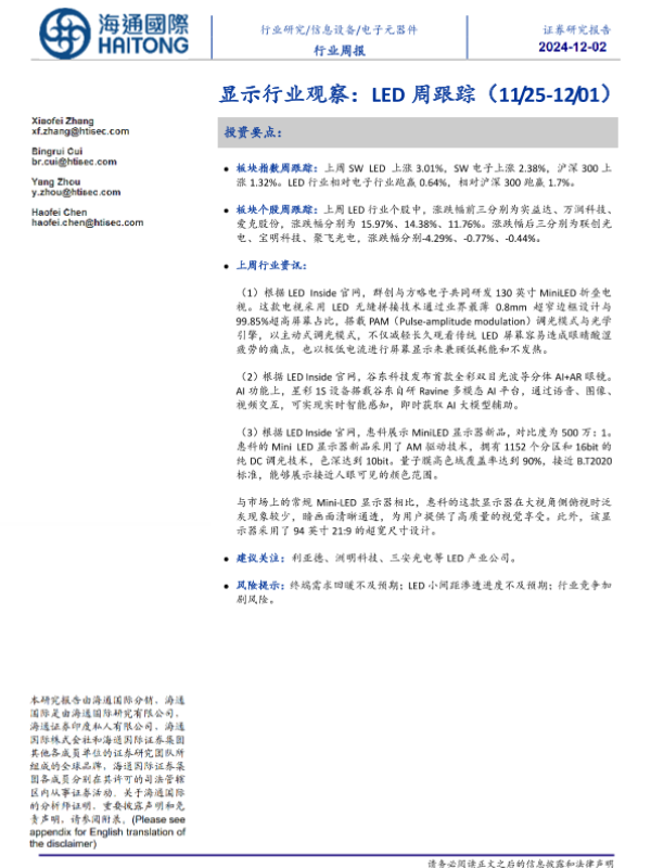 【海通国际】【20241202】显示行业观察:LED周跟踪-10页 行业研究