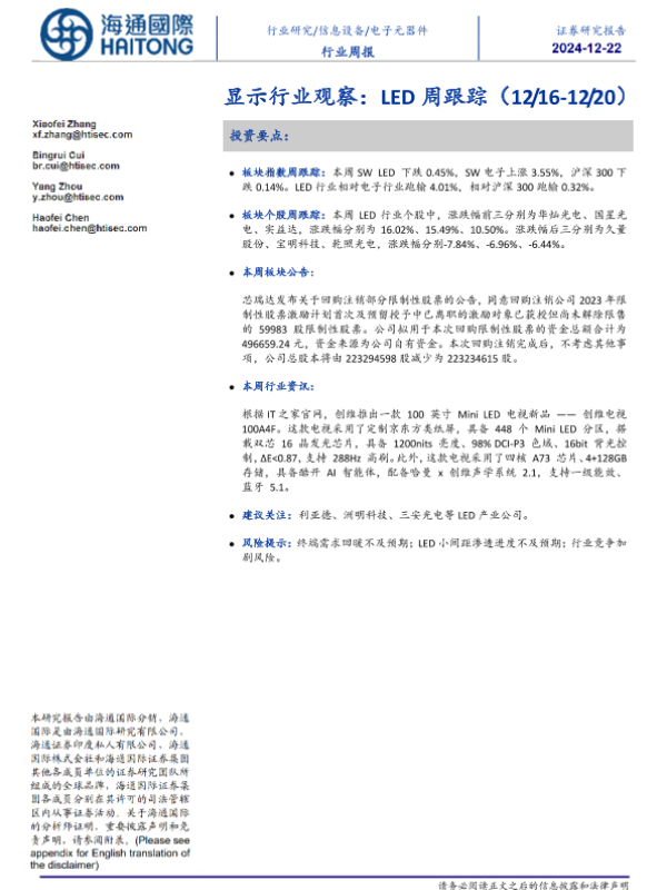 【海通国际】【20241220】显示行业观察:LED周跟踪-10页 行业研究