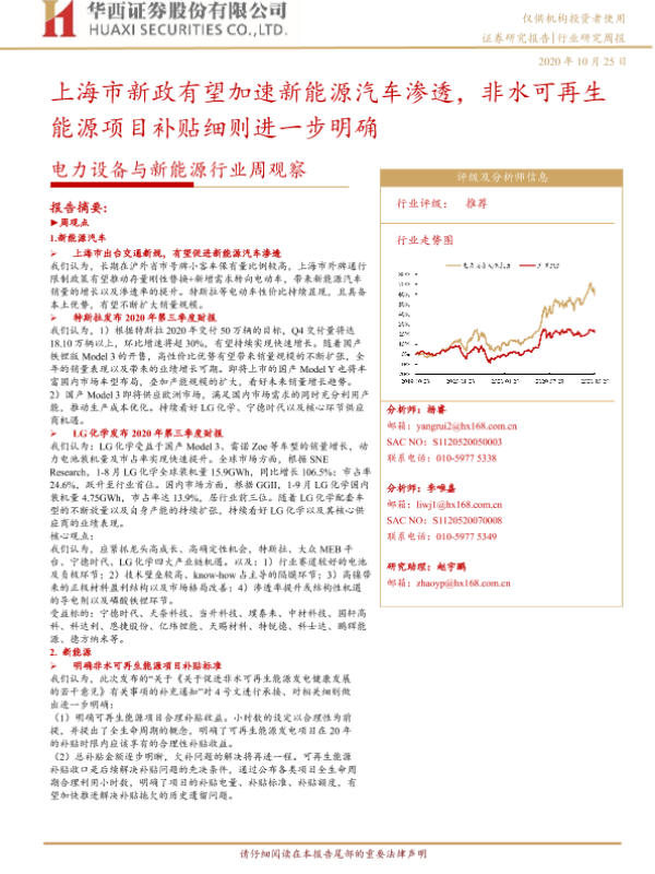 【华西证券】【20201025】电力设备与新能源行业周观察:上海市新政有望加速新能源汽车渗透,非水可再生能源项目补贴细则进一步明确-18页 行业研究