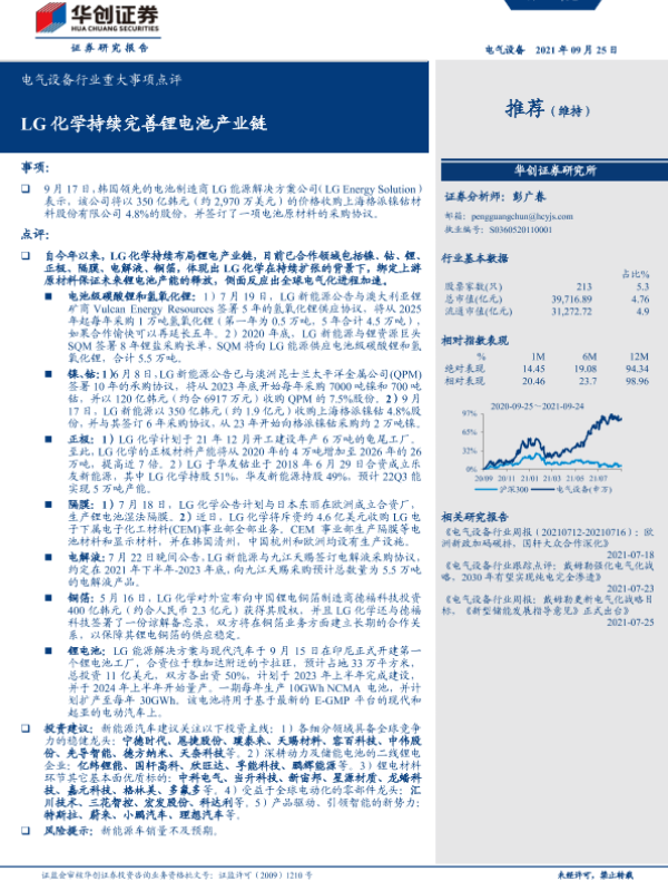 【华创证券】【20210925】电气设备行业重大事项点评:LG化学持续完善锂电池产业链-4页 行业研究