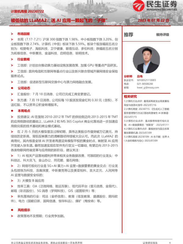 【民生证券】【20230722】20230722-民生证券-计算机周报:被低估的LLaMA2:送AI应用一颗起飞的“子弹”-24页 行业研究