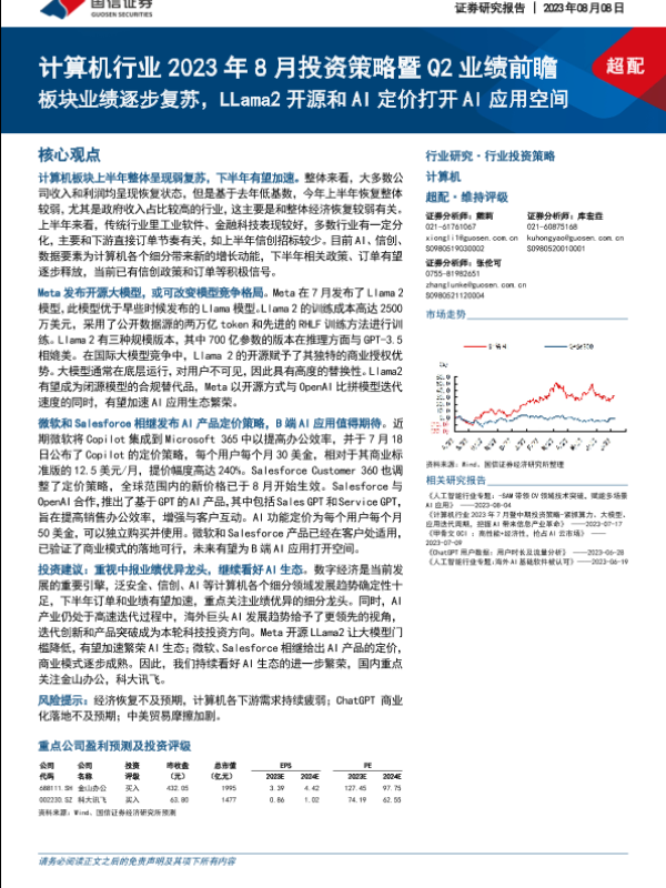 【国信证券】【20230808】计算机行业2023年8月投资策略暨Q2业绩前瞻:板块业绩逐步复苏,LLama2开源和AI定价打开AI应用空间-17页 行业研究