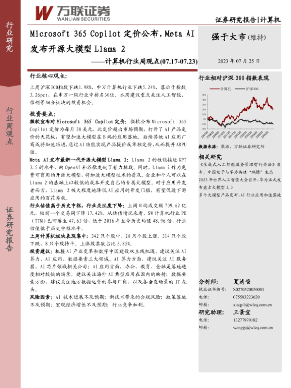 【万联证券】【20230725】20230725-万联证券-计算机行业周观点:Microsoft 365 Copilot定价公布,Meta AI发布开源大模型Llama 2-11页 行业研究