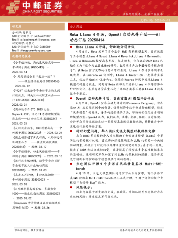 【中邮证券】【20250415】AI动态汇总:Meta+LIama+4开源,OpenAI启动先锋计划-24页 证券期货研究报告