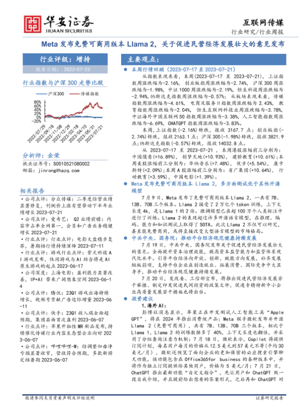 【华安证券】【20230723】互联网传媒行业周报:Meta发布免费可商用版本Llama2,关于促进民营经济发展壮大的意见发布-35页 行业研究