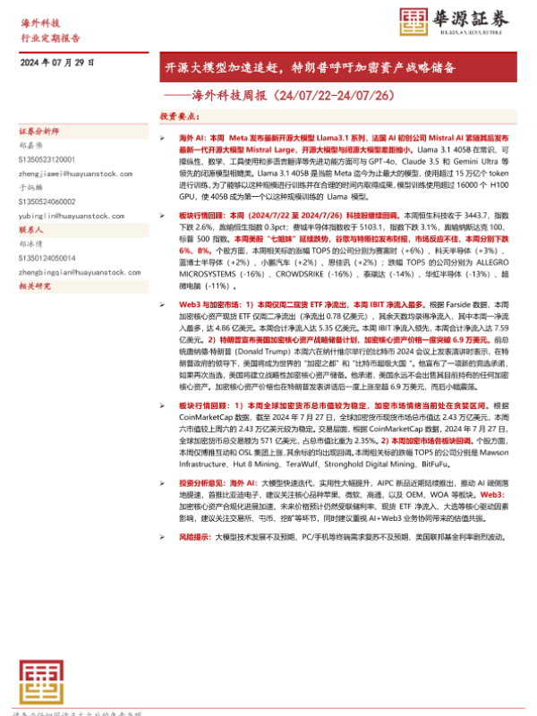 【华源证券】【20240729】海外科技周报:开源大模型加速追赶,特朗普呼吁加密资产战略储备-15页 行业研究