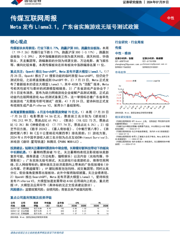 【国信证券】【20240729】20240729-国信证券-传媒互联网周报:Meta发布Llama3.1,广东省实施游戏无版号测试政策-15页 行业研究