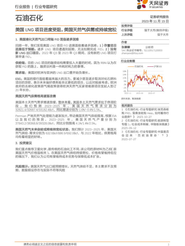 【天风证券】【20231115】石油石化行业专题研究-美国LNG项目进度受阻-美国天然气供需或持续宽松-10页 行业研究