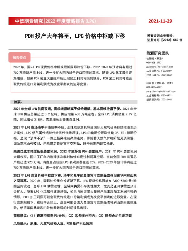 【中信期货】【20211129】2022年度策略报告(LPG) :PDH投产大年将至,LPG价格中枢或下移-17页 行业研究