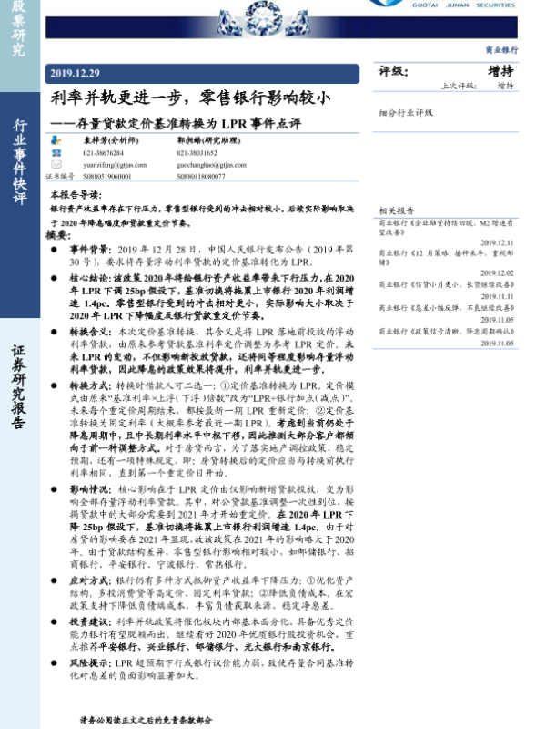 【国泰君安证券】【20191229】存量贷款定价基准转换为LPR事件点评-8页 行业研究