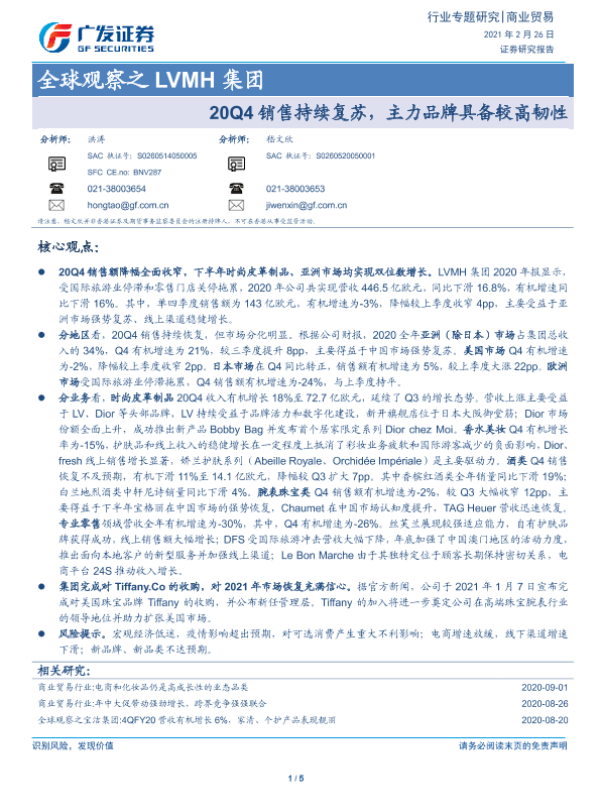 【广发证券】【20210226】全球观察之LVMH集团-20Q4销售持续复苏,主力品牌具备较高韧性-5页 行业研究