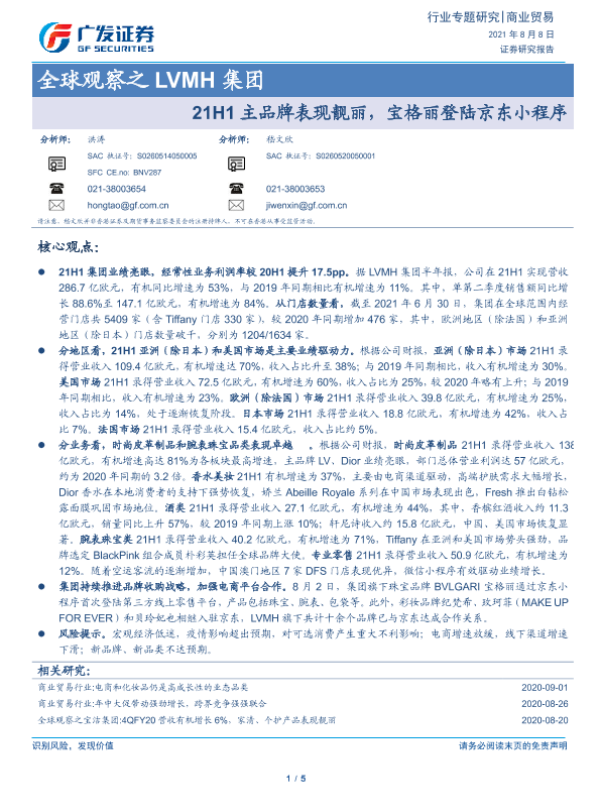 【广发证券】【20210808】全球观察之LVMH集团-21H1主品牌表现靓丽,宝格丽登陆京东小程序-5页 行业研究