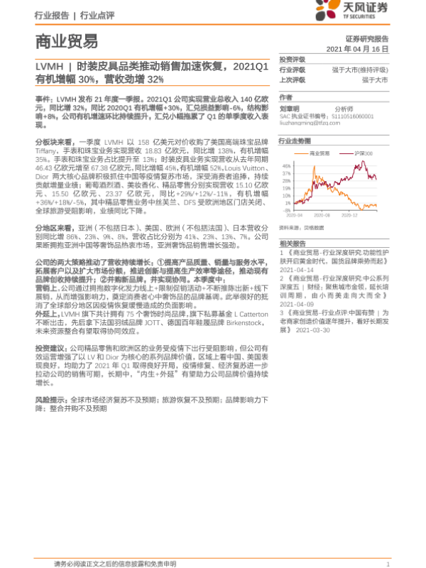 【天风证券】【20210416】LVMH 时装皮具品类推动销售加速恢复,2021Q1有机增幅30%,营收劲增32%-5页 行业研究