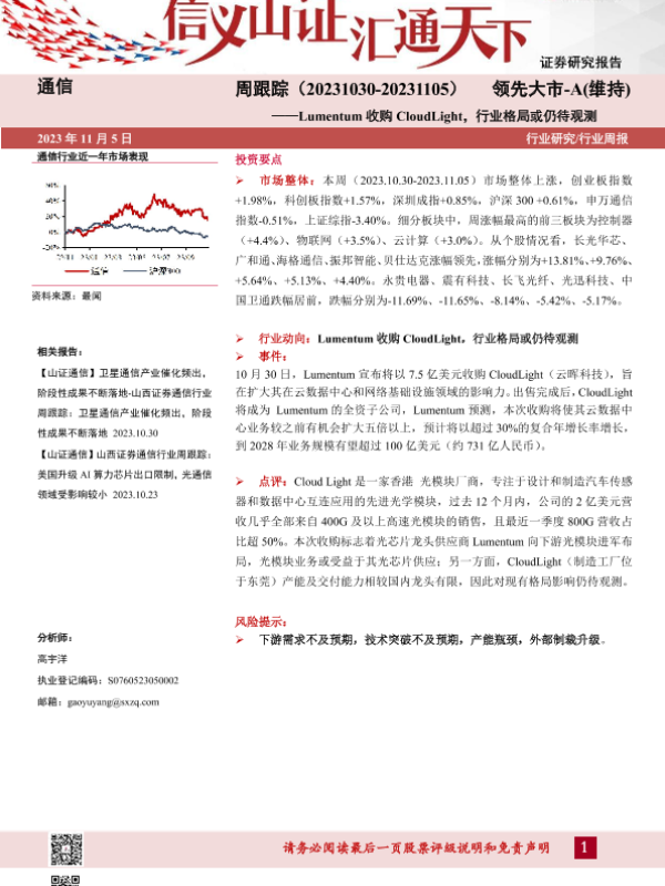 【山西证券】【20231105】通信周跟踪:Lumentum收购CloudLight,行业格局或仍待观测-18页 行业研究